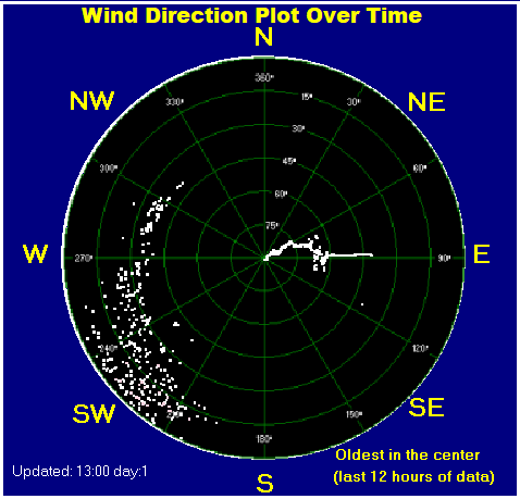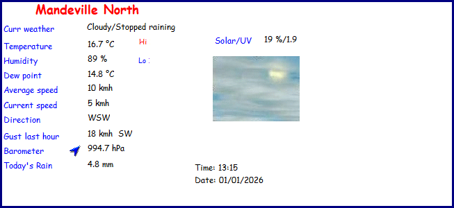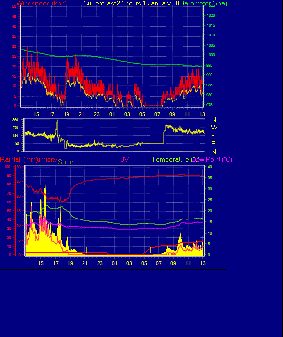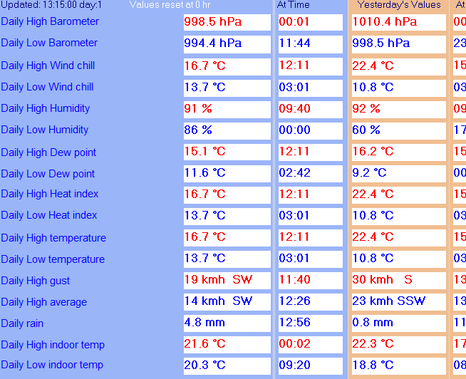 Daily high pressure 991.3 hPa Daily low pressure 990.0 hPa Daily low windchill 7.3°C Daily high heat index 13.5°C Daily high gust speed 34 kmh NW Daily high average speed 27 kmh NNW