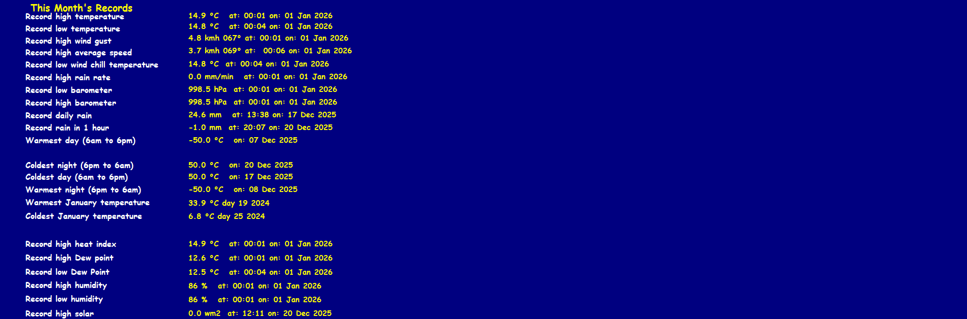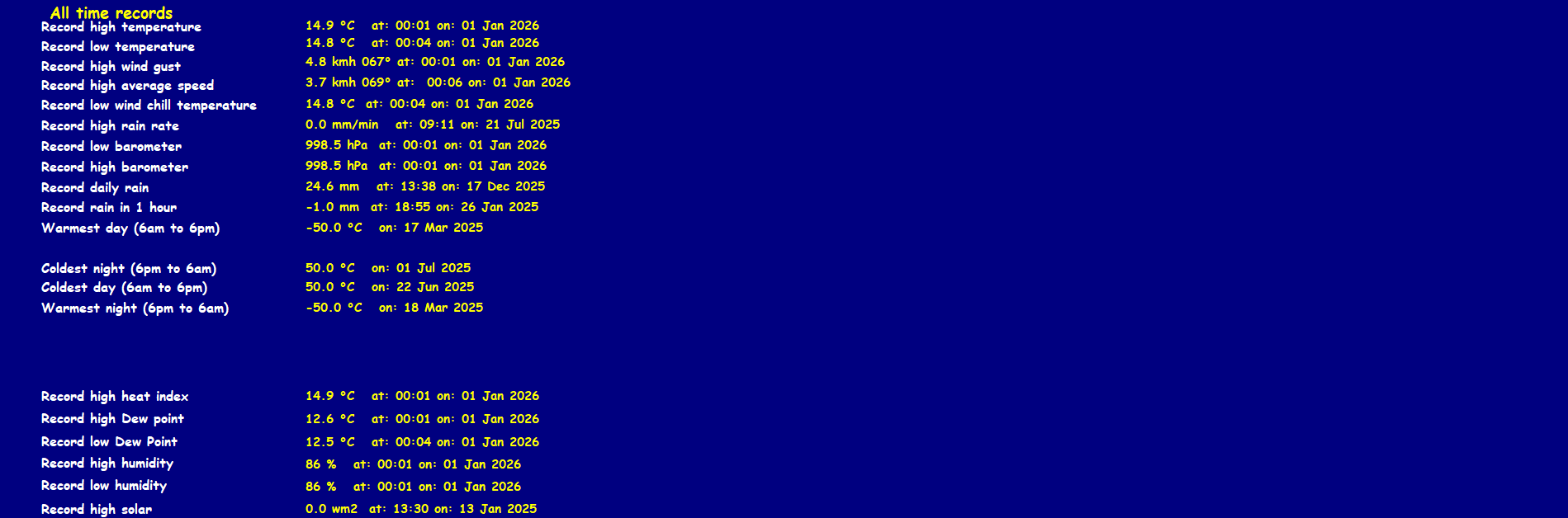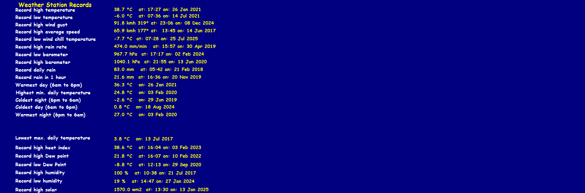 Record high temperature 38.7°C Record low temperature -6.0°C Record high gust 91.8 km/h Record high average 65.9 km/h Record daily rain 83.0 mm Record low windchill -7.7°C Record high barometer 1040.1 hPa Record low barometer 967.7 hPa