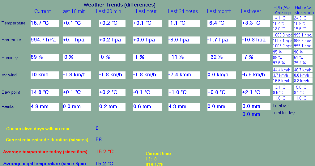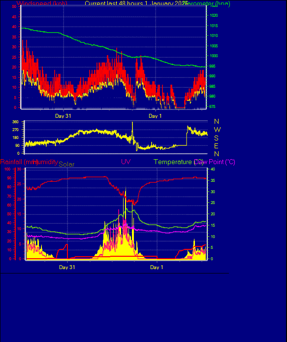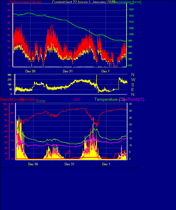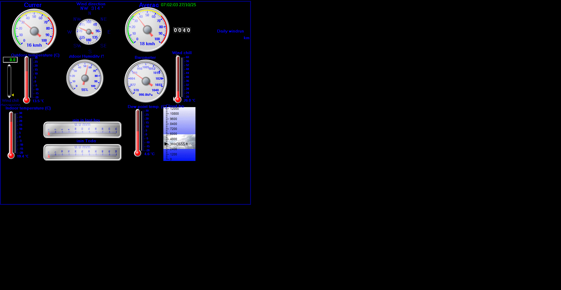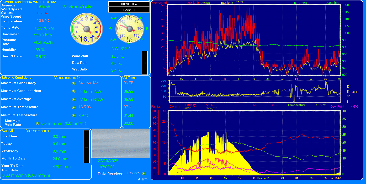 Daily high pressure 991.3 hPa Daily low pressure 990.0 hPa Daily low windchill 7.3°C Daily high heat index 13.5°C Daily high gust speed 34 kmh NW Daily high average speed 27 kmh NNW